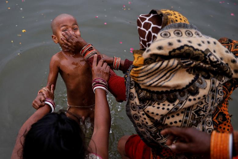 A woman holds the nose of her son as she dips him at Sangam, the confluence of the Ganges, Yamuna and Saraswati rivers, ahead of the "Kumbh Mela", or the Pitcher Festival, in Prayagraj, previously known as Allahabad, India, January 13, 2019. (REUTERS/Danish Siddiqui)