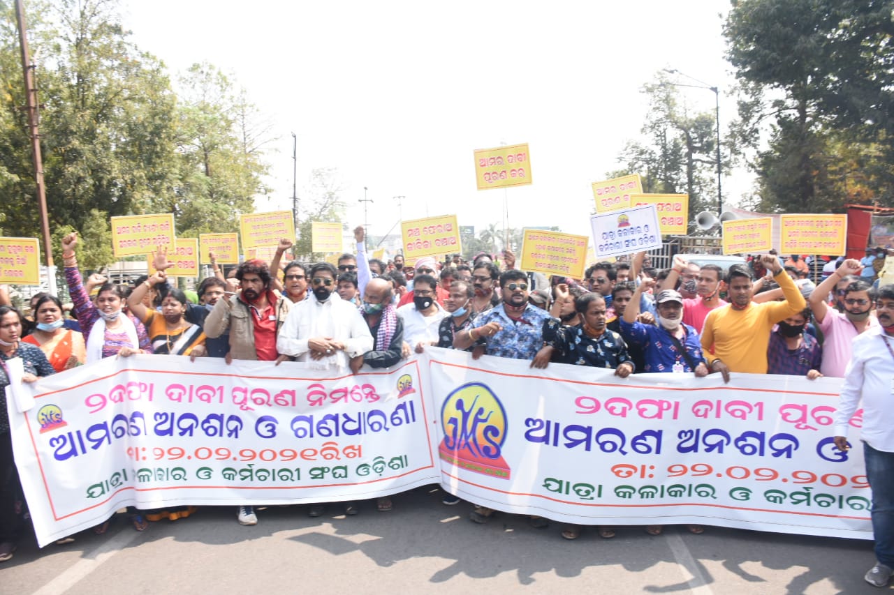 Bhubaneswar: Demanding permission to conduct opera shows with at least 2,000 spectators, opera artistes under the banner of ‘Jatra Kalakar O Karmachari Sangha’ launched an indefinite fast unto death protest at Lower PMG here Monday.
