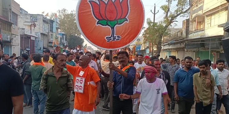 Nuapada: Celebrations swept across Nuapada Friday as counting for the Nuapada Assembly byelection concluded and a grand victory procession marked the occasion. Supporters erupted in jubilation following Jay Dholakia’s decisive win, with villages and the town echoing with chants in his honour. Streets across the region were filled with festive enthusiasm as people played out the colours of victory. At around 5pm, Jay Dholakia and his wife, Suman Dholakia, joined party leaders, workers and supporters in a victory procession that began at the Ram Temple on Khariar Road.