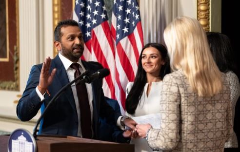 Patel’s girlfriend, Alexis Wilkins, held the Bhagavad Gita as he took the oath in the Indian Treaty Room at the Eisenhower Executive Office Building Friday, with his family members in attendance. Patel, at 44, becomes the first Hindu-Indian and Asian descent person to head the FBI.