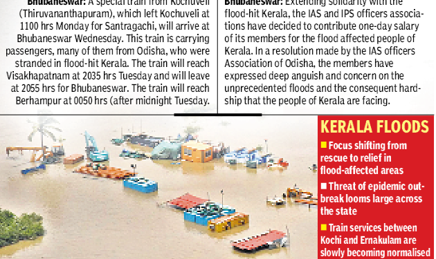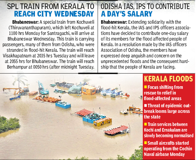A few trains packed with people are running between state capital Thiruvananthapuram and Ernakulam, 200 km apart. Floodwater has started receding in some areas. However, the bigger concern now is lack of clean drinking water and diseases due to mosquito infestation. Commercial flight operations to Kochi also resumed Monday after the Navy activated its airstrips to accommodate small passenger aircraft.