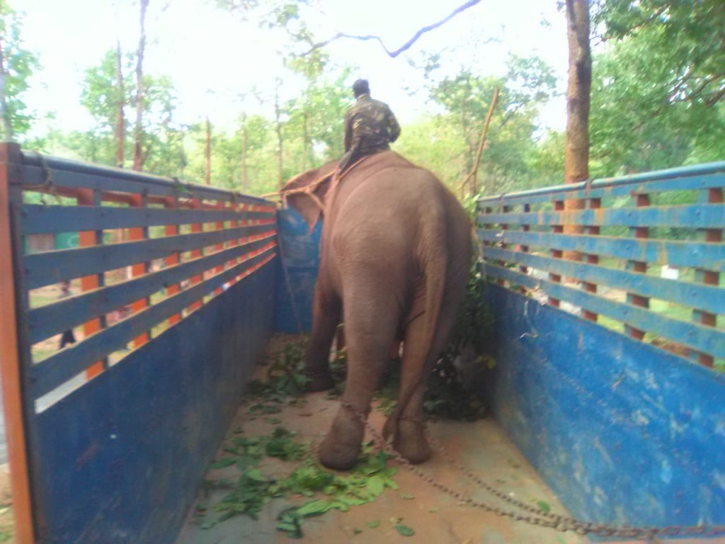The female elephant was brought from Chandaka sanctuary to help in tranquilising the tigress which had unleashed a a reign of terror by allegedly killing two persons in villages on the fringes of the Satkosia sanctuary. The elephant was loaded on a truck and was taken back to Chandaka sanctuary Saturday.