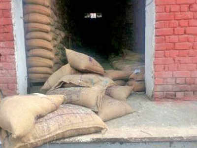 Bargarh: Leakages in the roof of Kalamani market yard godown where sacks of food grains are stacked have left farmers worried.