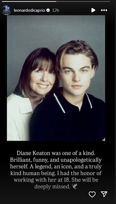 Sharing a photo of himself and Keaton seemingly taken around the time of filming some three decades ago, Leonardo DiCaprio wrote on his Instagram Stories, “Diane Keaton was one of a kind. Brilliant, funny, and unapologetically herself. A legend, and icon, and a truly kind human being. I had the honor of working with her at 18. She will be deeply missed”.