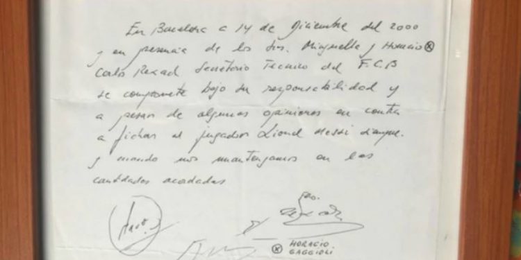 The napkin, bearing the date December 14, 2000, bears the signatures of Gaggioli, another agent, Josep Maria Minguella and Barcelona’s then-sporting director, Carles Rexach, who met at a tennis club in Barcelona.