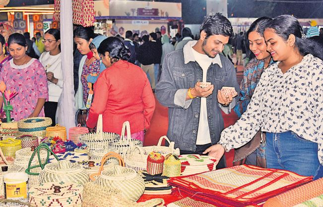 While visitors are showing keen interest in purchasing traditional products, Monday (third day) saw the live craft counters grabbing the attention of the audience. A wide range of products is being created live, including wallets, fruit baskets, coasters, dining mats, mirrors, boxes and other household items made from Sabai grass.