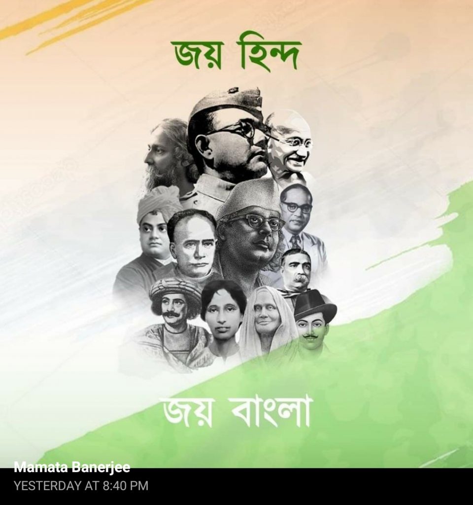 The picture of Trinamool’s official Twitter and Facebook accounts also were changed to ‘Jay Hind, Jay Bangla’ with pictures of Mahatma Gandhi, revolutionary leaders Netaji Subhas Chandra Bose, Bhagat Singh, Matangini Hazra, Nobel laureate poet Rabindranath Tagore, and rebel poet Kazi Nazrul Islam.
