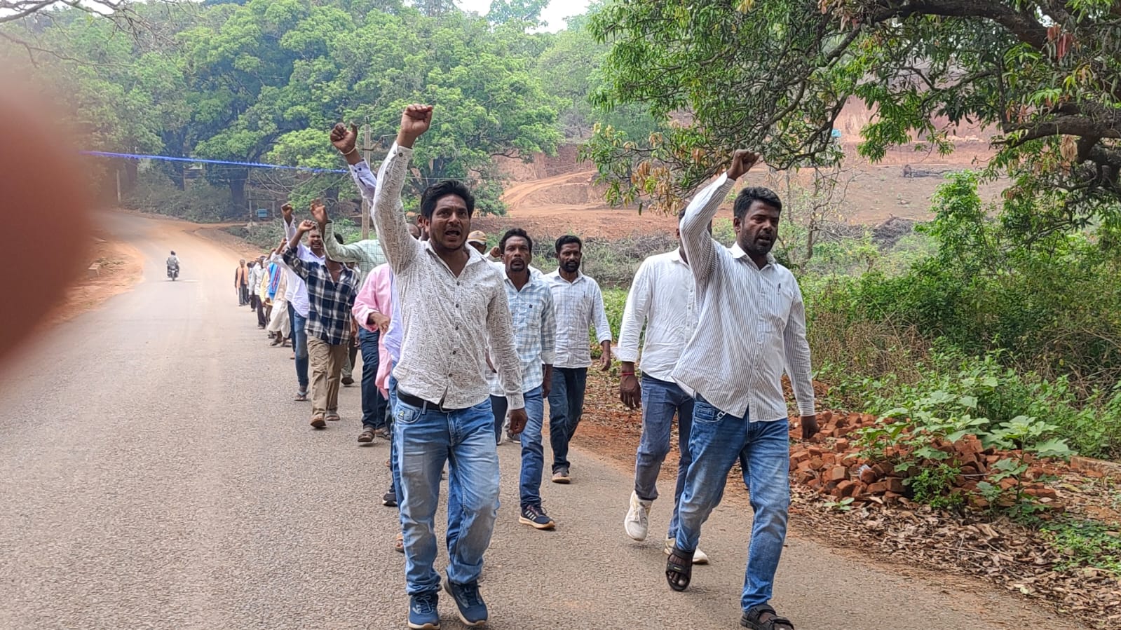 Protesters raised slogans such as “Vedanta company murdabad,” “Mythri company murdabad,” and “Mythri company go back,” expressing strong opposition to Mythri Infra and Vedanta Ltd.