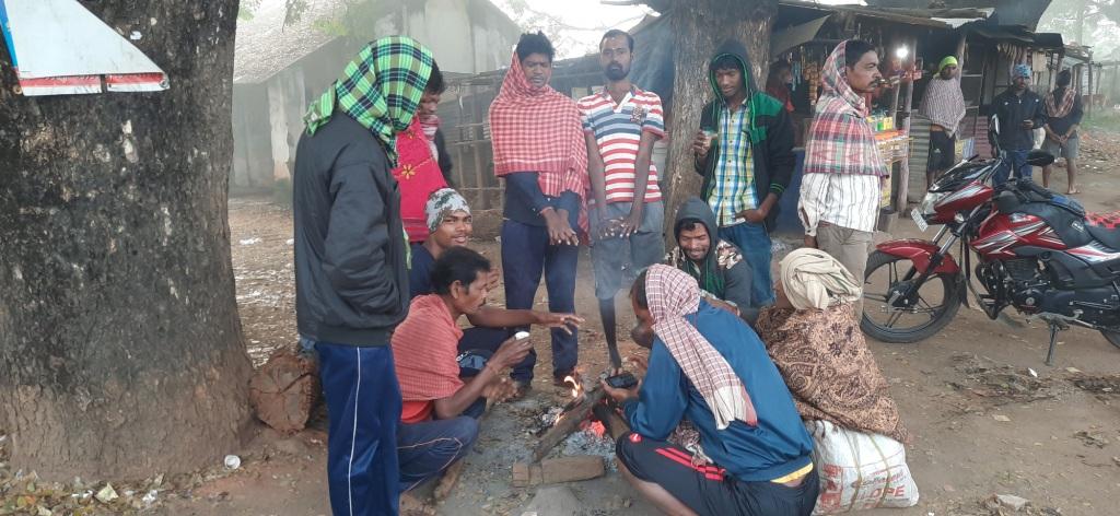People sit around a bonfire to warm themselves up as temperature dips to 12° Celsius at Daringbadi in Kandhamal distrct.