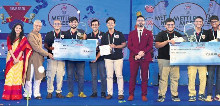 Winners of senior category of Mettle Meet 2025, AIIMS-Bhubaneswar, receiving a cheque of Rs 1 lakh from OrissaPOST Editor Tathagata Satpathy; Champions of junior category, DAV Public School Unit-8, Bhubaneswar with the winning cheque pose for a photo, as the newspaper’s Chief Executive Adyasha Satpathy, Manish Agarwal of Ajanta Advertisers and quizmaster Ajay Poonia look on in Bhubaneswar, Sunday