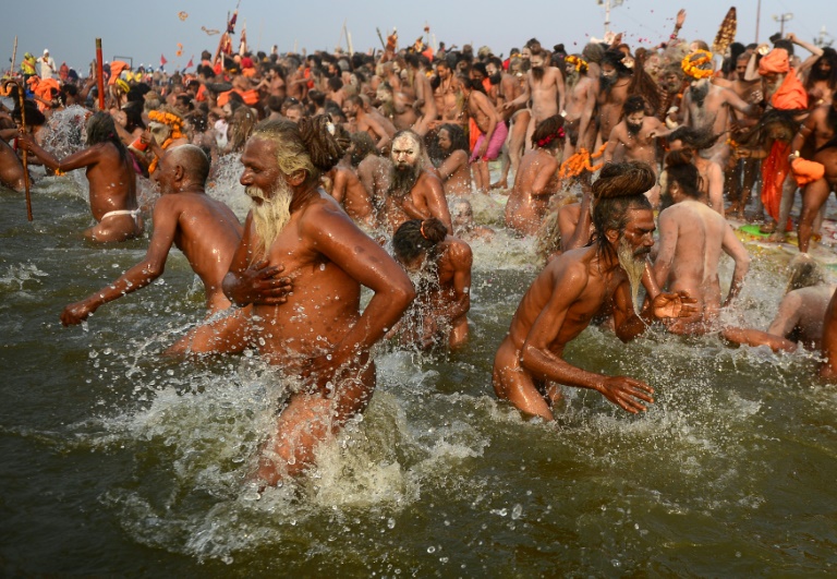 Thousands of Naga Sadhus, a devout, fierce and famously nude sect of followers of the Hindu god Shiv, and other holy men clad in saffron robes, led the mass bathing in the chilly waters, some brandishing swords and tridents.