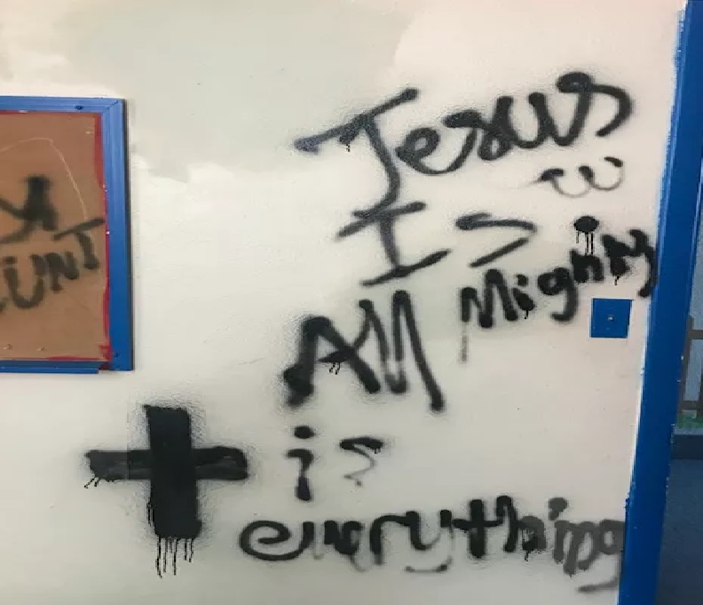 In an upstairs room, profane messages were spray-painted on the walls along with several black crosses. Phrases including “Jesus is all mighty”, “Jesus is Lord” and “God” were also sprayed in black paint on the walls.