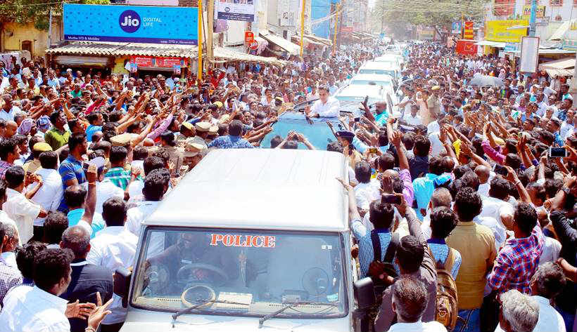 Actor-turned-politician Kamal Haasan greets supporters during a public rally to launch his party, at Raj Mahal in Tamil Nadu’s Pollachi Feb 21, 2018. (IANS)