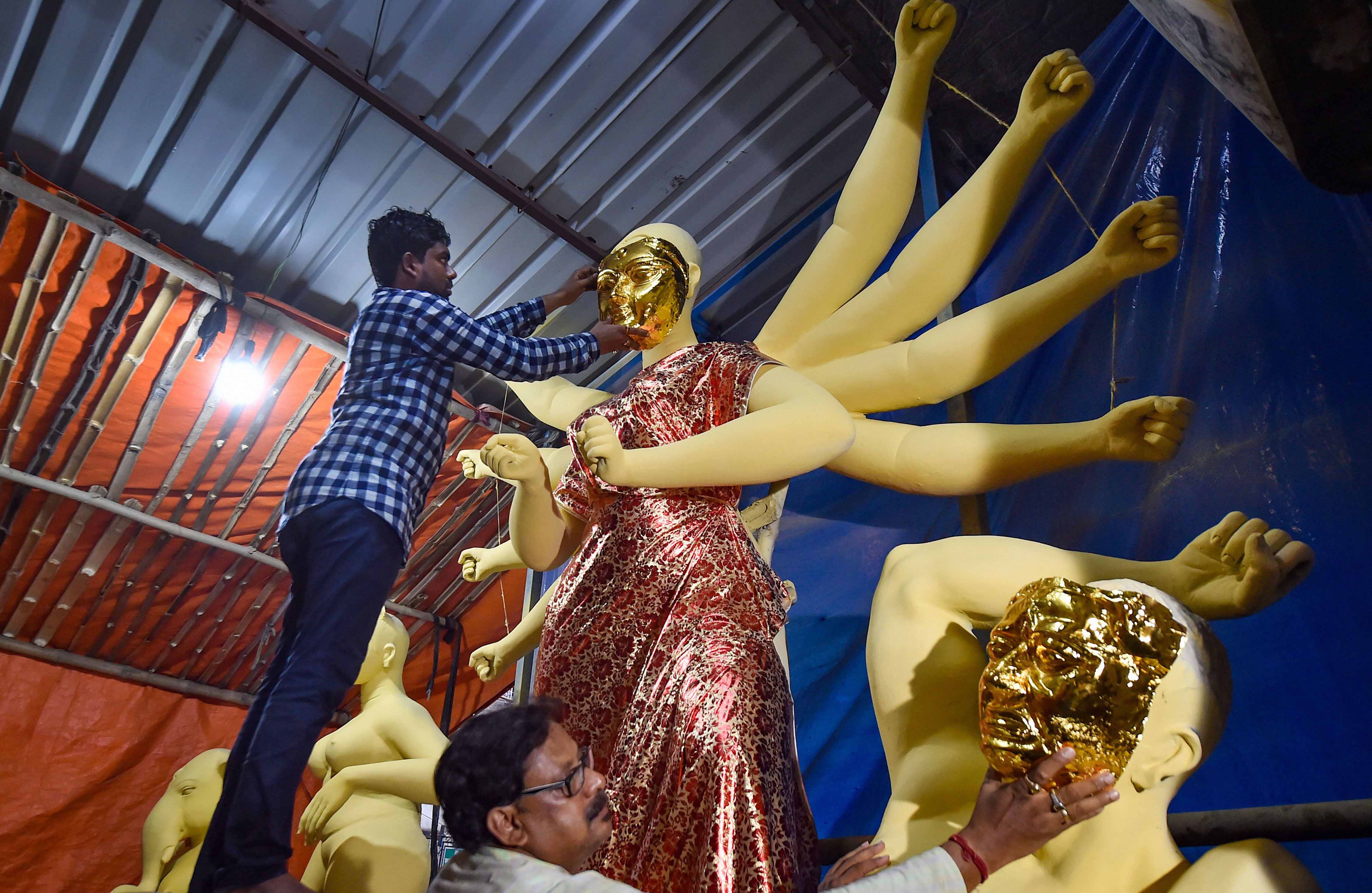 Kolkata: From Goddess Durga clicking a photograph of a visitor with an AI smart camera in one puja marquee, to drawing of traditional ‘alpana’ before the idol by gender minorities in another – Durga pujas in this city have everything on offer.