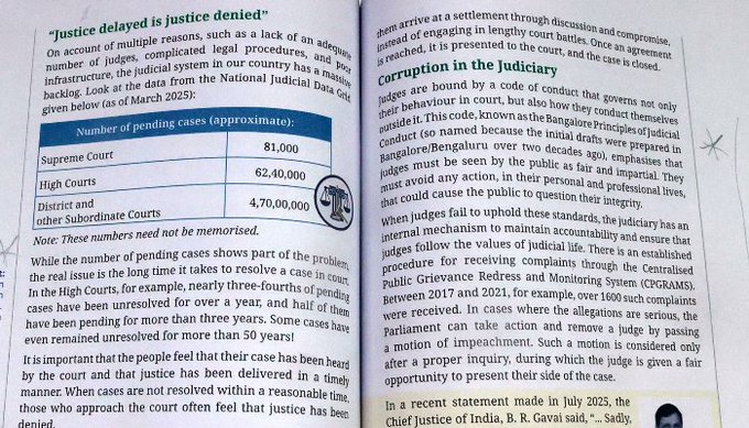 The textbook also quotes former Chief Justice of India B R Gavai, who in July 2025 said that instances of corruption and misconduct within the judiciary had a negative impact on public confidence.