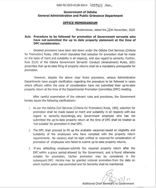 As per the Odisha Government Servants’ Conduct (Amendment) Rules, 2021, up-to-date filing of property statements is a prerequisite for promotion. However, several departments have sought clarification about it at different times. So, a fresh circular was issued with clarification, an official said.