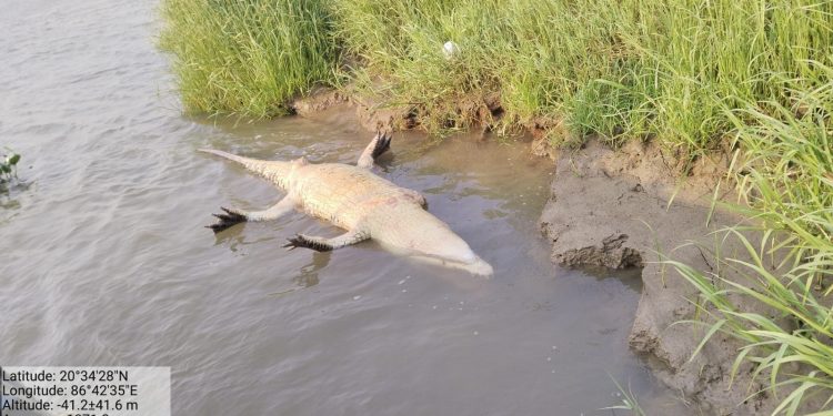 Rajnagar: A crocodile measuring 11 feet 3 inches in length was found dead in the Hansua River in Rajnagar area of Kendrapara district, forest officials said Tuesday.