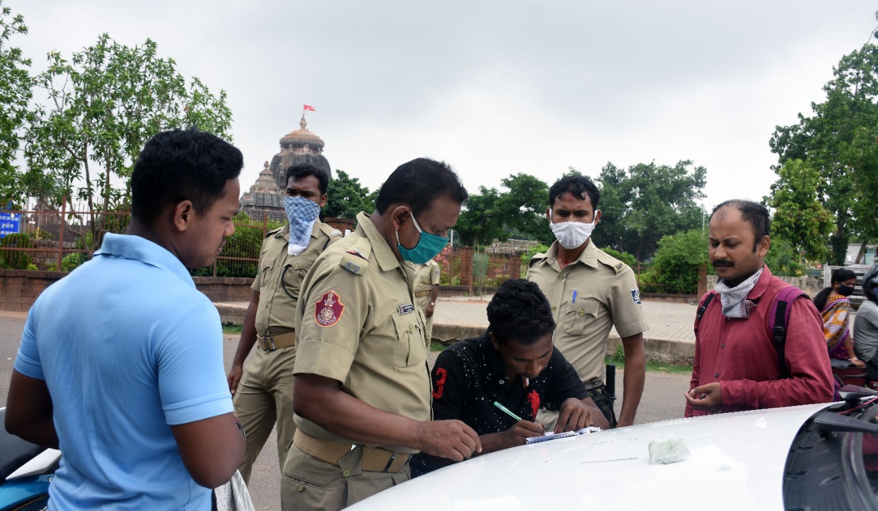 Cops fine riders travelling without masks in front of Lingaraj temple in Bhubaneswar