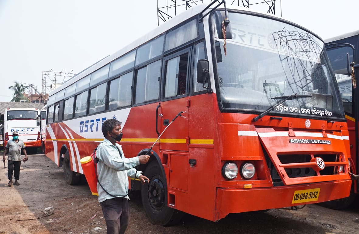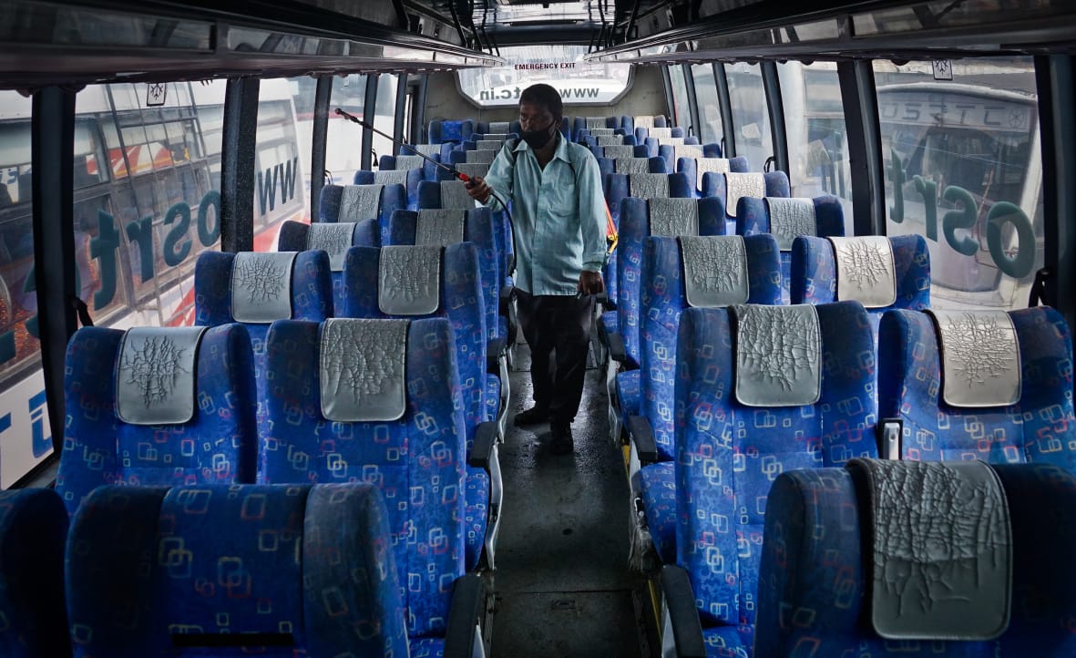 A worker sanitizing a bus before its departure from the Badambadi Bus Terminus in Cuttack.