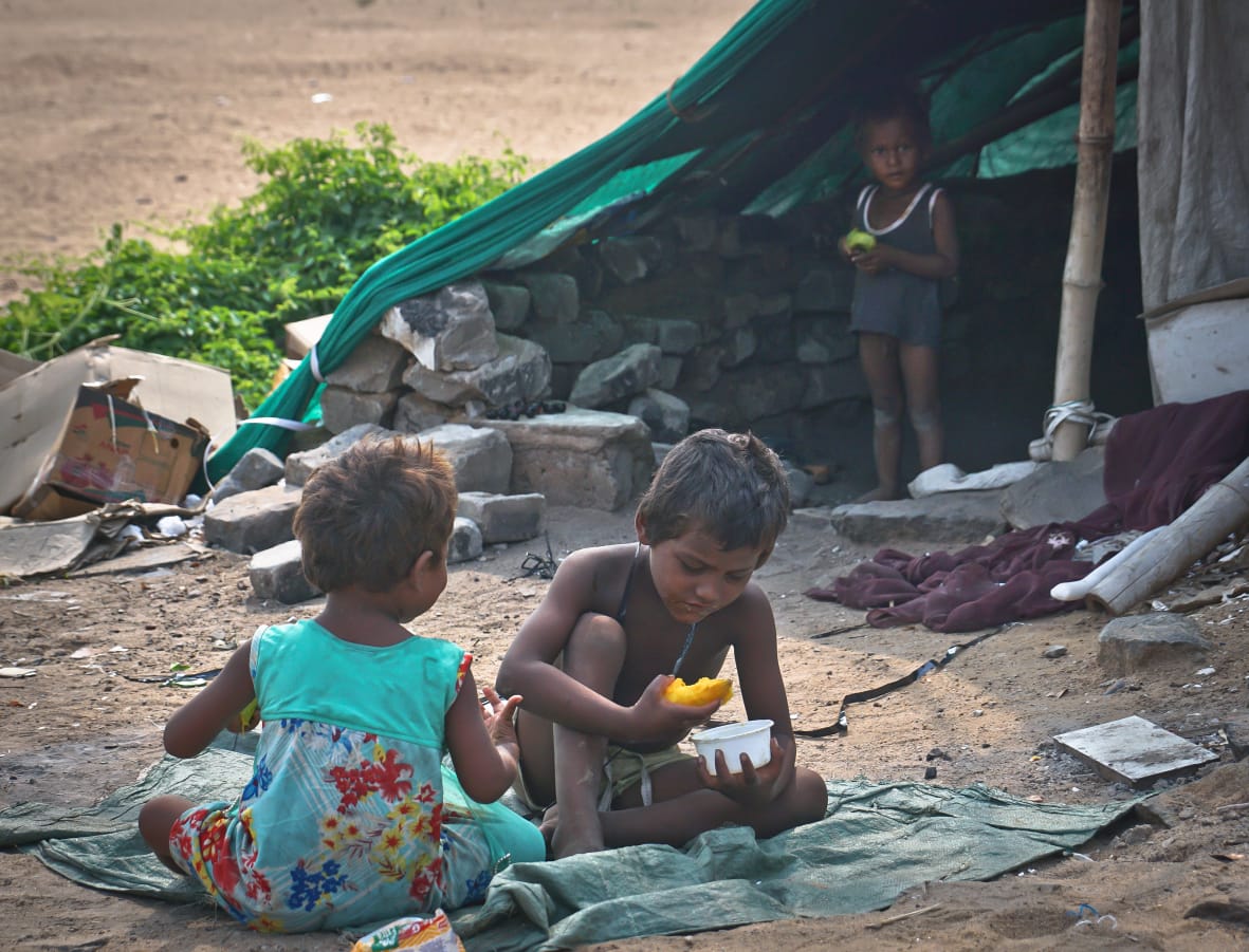 A kid enjoys a mango in front of his thatched hut at Matamatha Mahanadi Ring road, Cuttack.