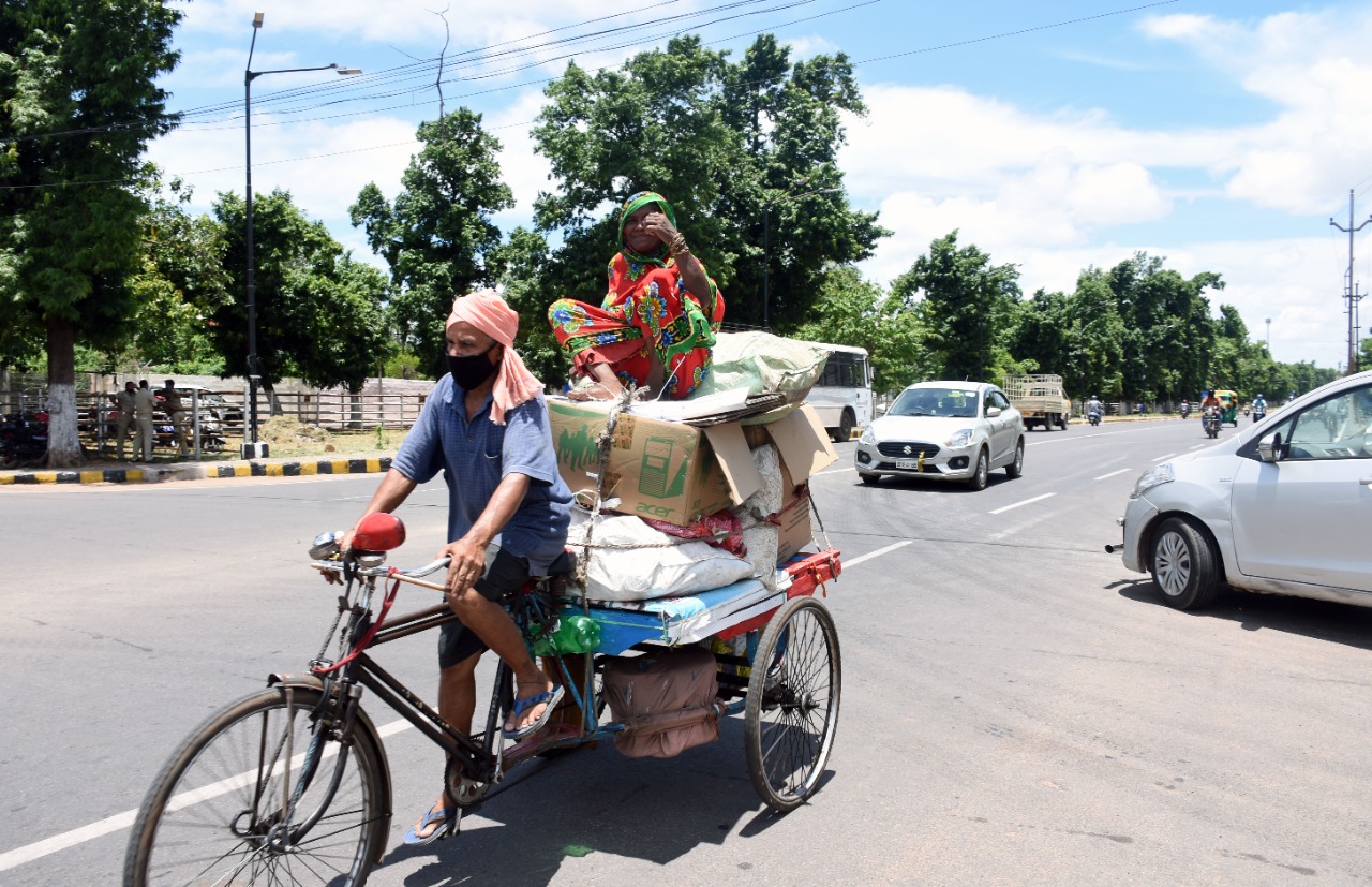 A woman sits dangerously atop a loading rickshaw in Bhubaneswar