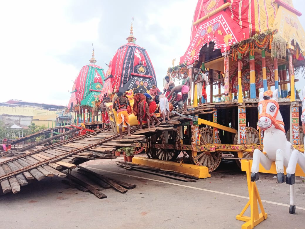 Servitors carry a wooden charioteer to a storeroom at Dolabedi in Puri after the conclusion of annual Rath Yatra