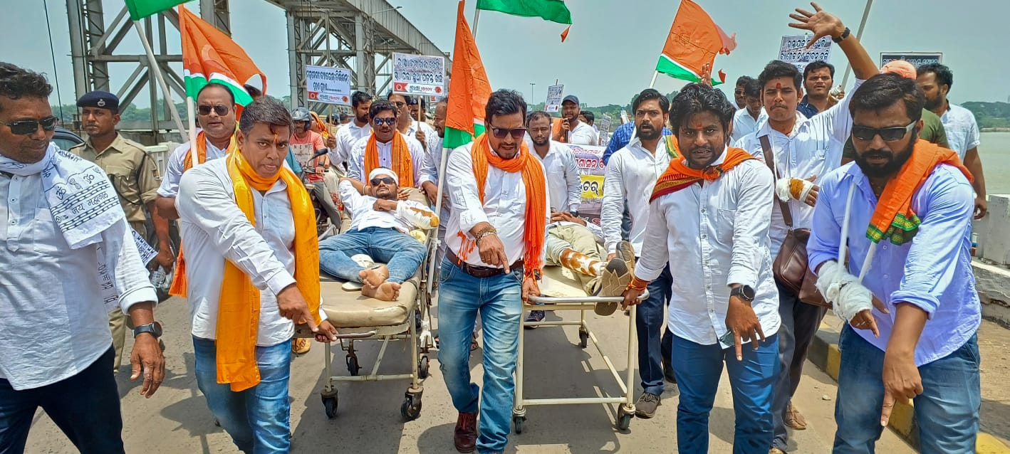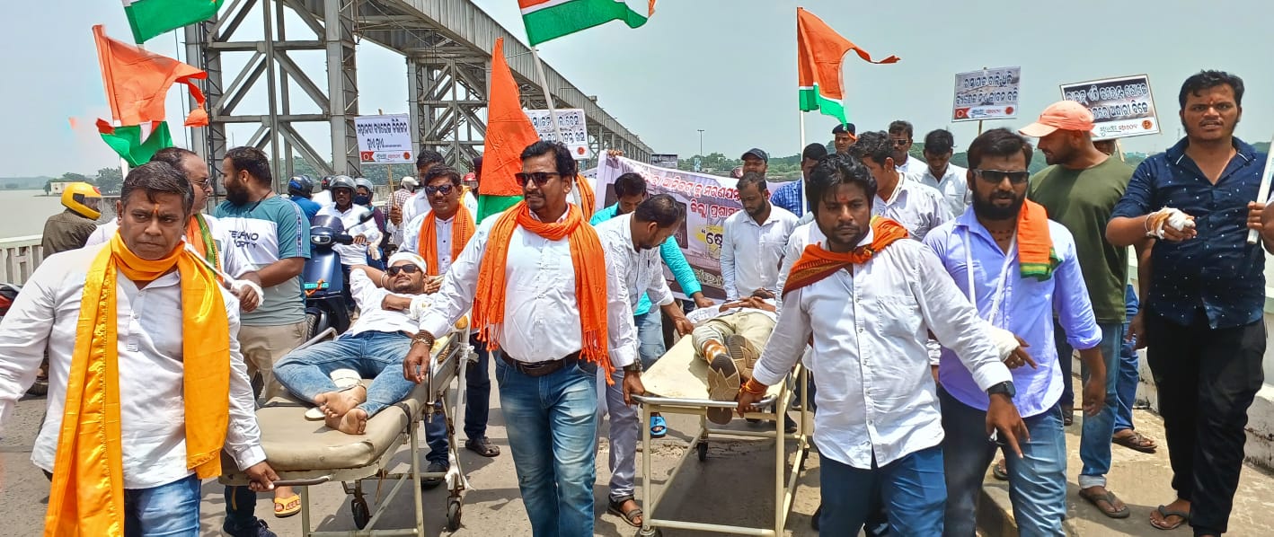 Unique protest using stretchers, bandages to highlight poor shape of road at Jobra anicut in Cuttack