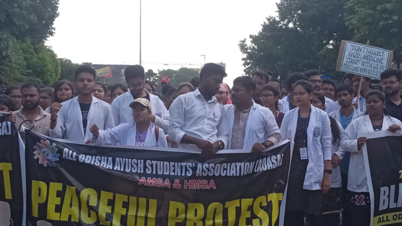 Demonstration by AYUSH students at Bhubaneswar’s Lower PMG over fulfillment of their five-point charter of demands