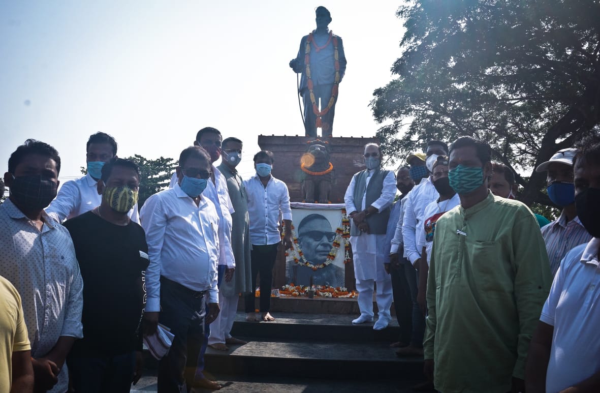 MP Bhartruhari Mahtab garlands statue of Harekrushna Mahatab at Cuttack Press Square on his 121st birth anniversary