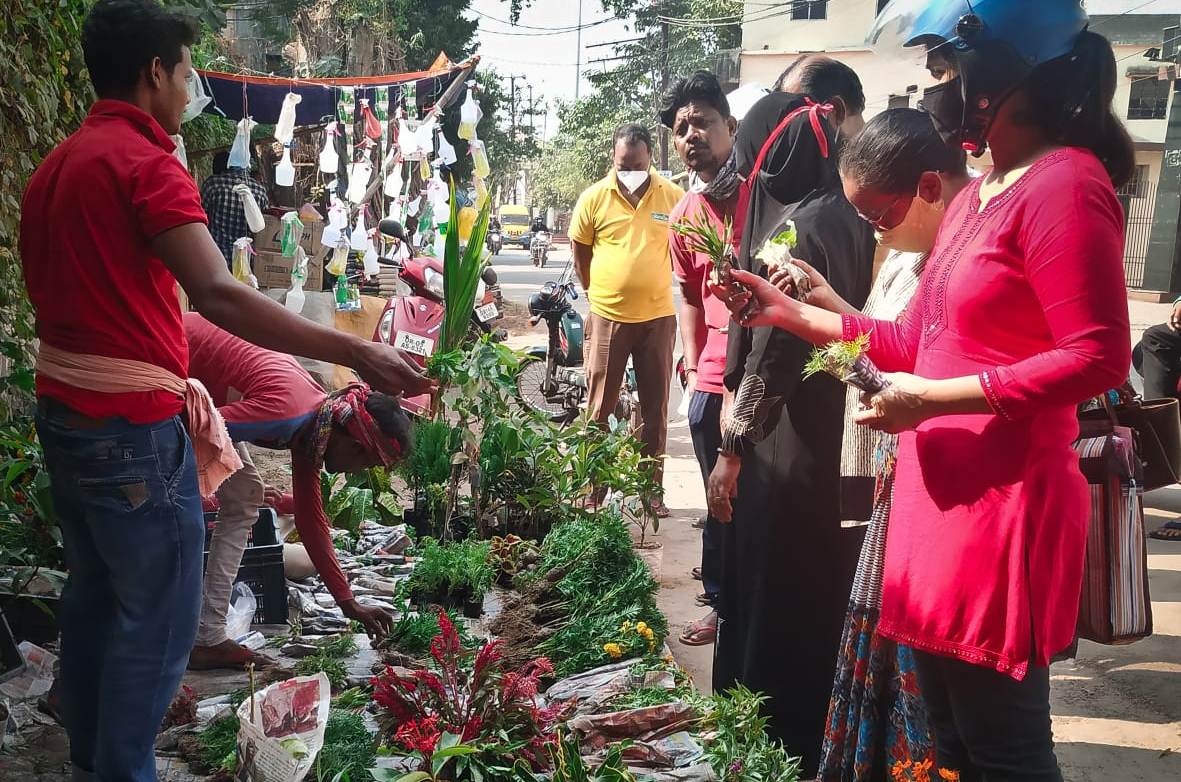 Customers line up to buy flowering plants at Cuttack Kacheri Road