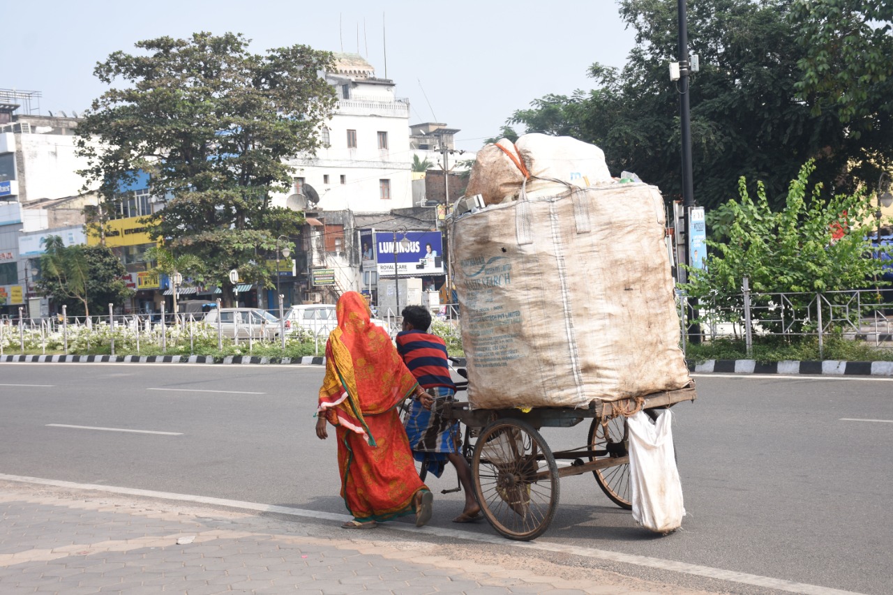 A couple pull a scrap-laden trolley-rickshaw in a deserted Rajmahal road in the capital city