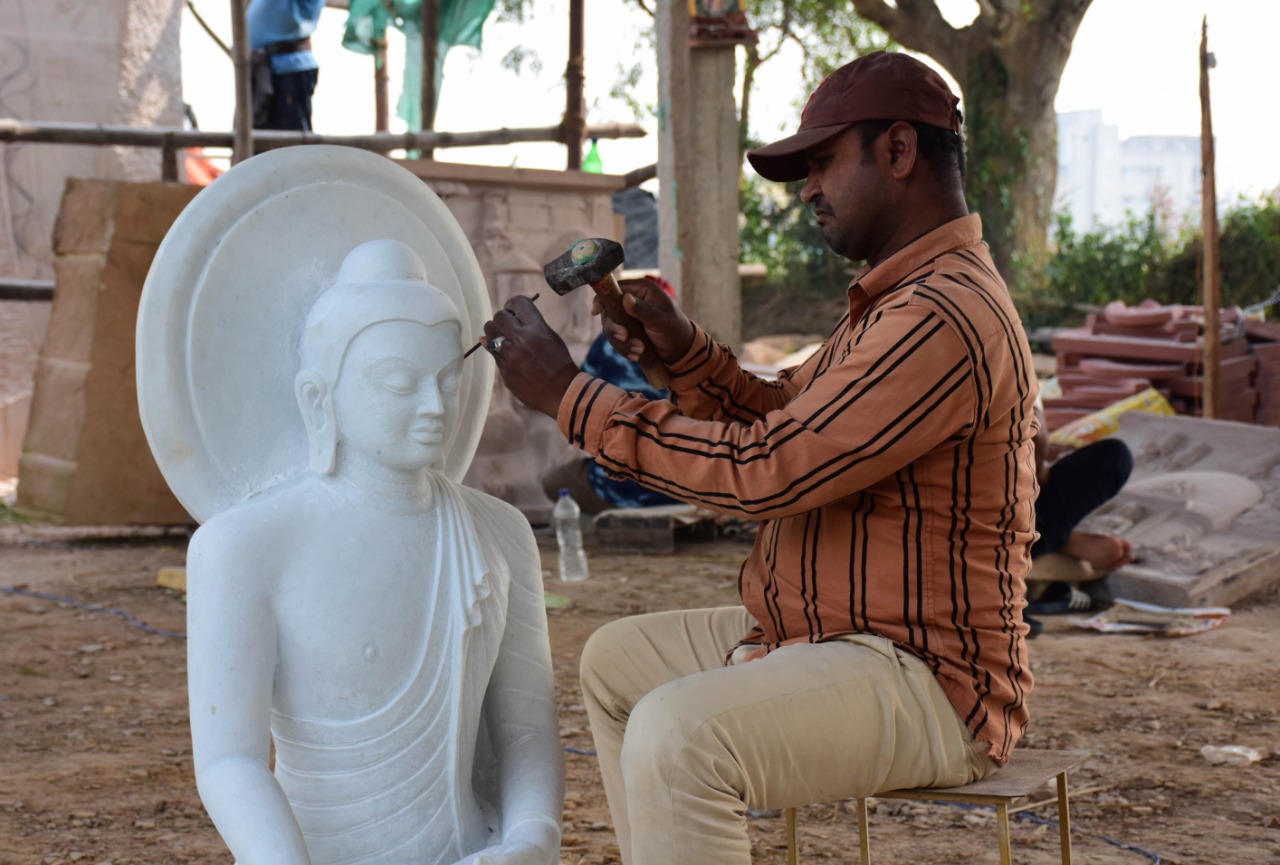 A sculptor hammering a Buddha statue to give the finest curve on the outskirts of Bhubaneswar