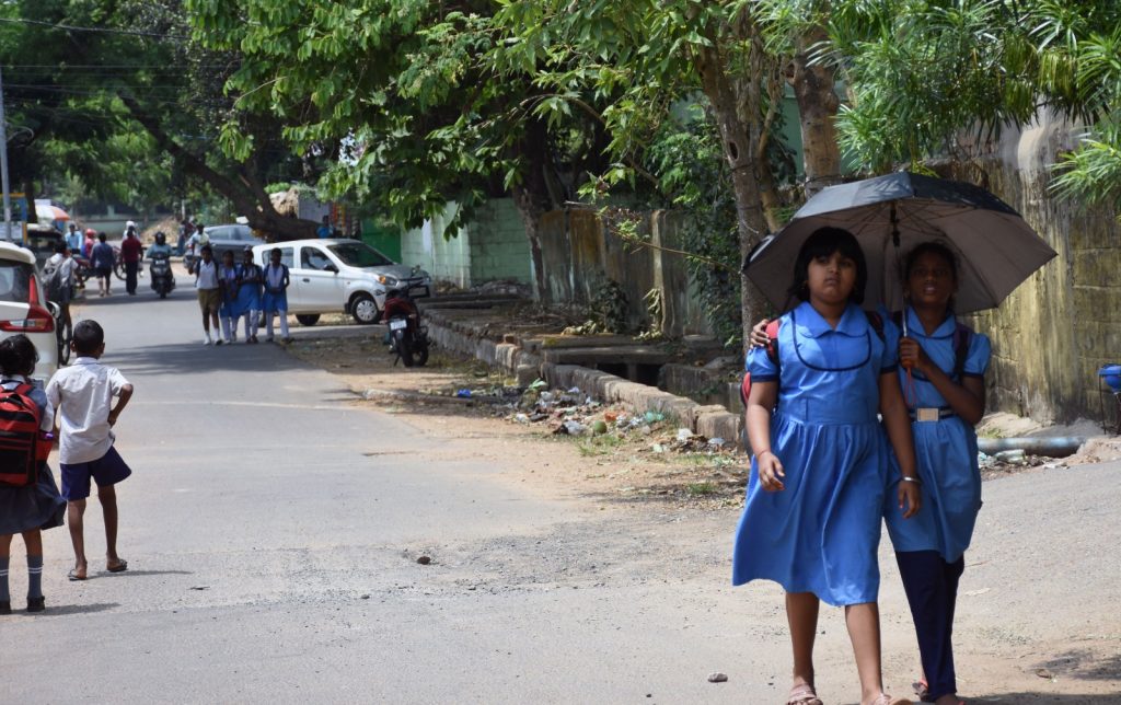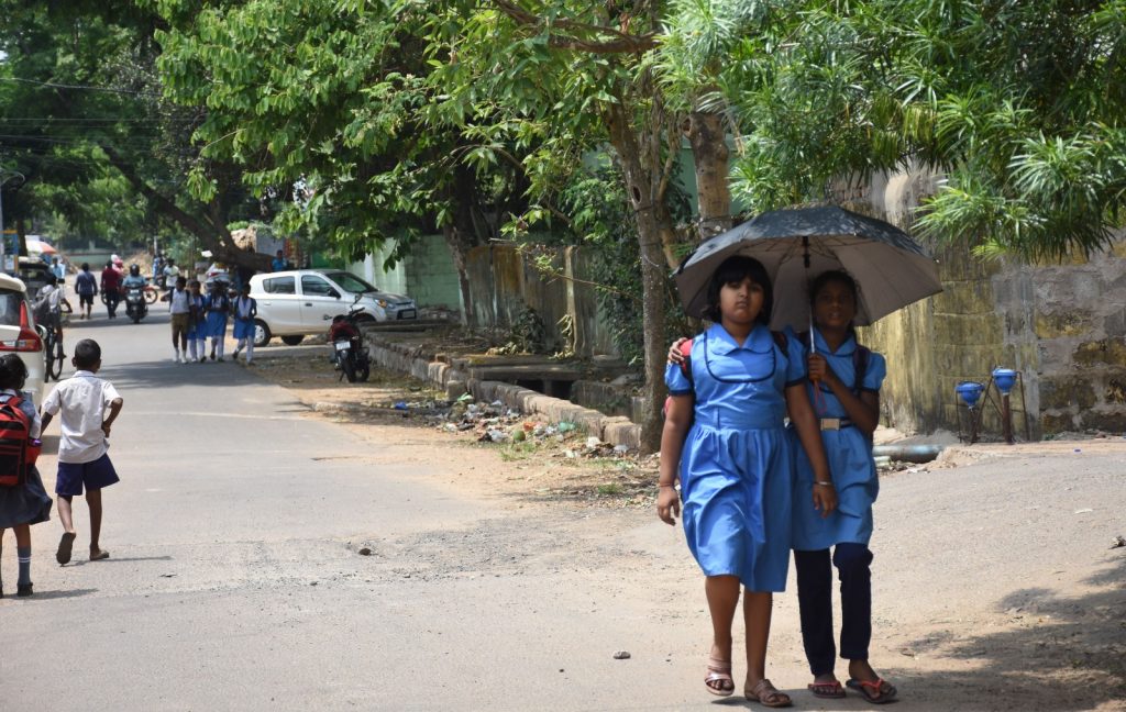 Kids return from school in Bhubaneswar after morning classes