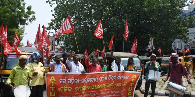 On the occasion of International Labour Day, members of the AITUC protest at Rajmahala Square