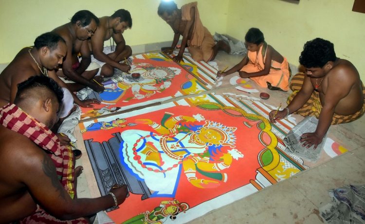 Painter servitors of Puri Jagannath temple paint the pictures of Lord Jagannath and His siblings on mats ahead of ‘Anasara’ ritual of Holy Trinity