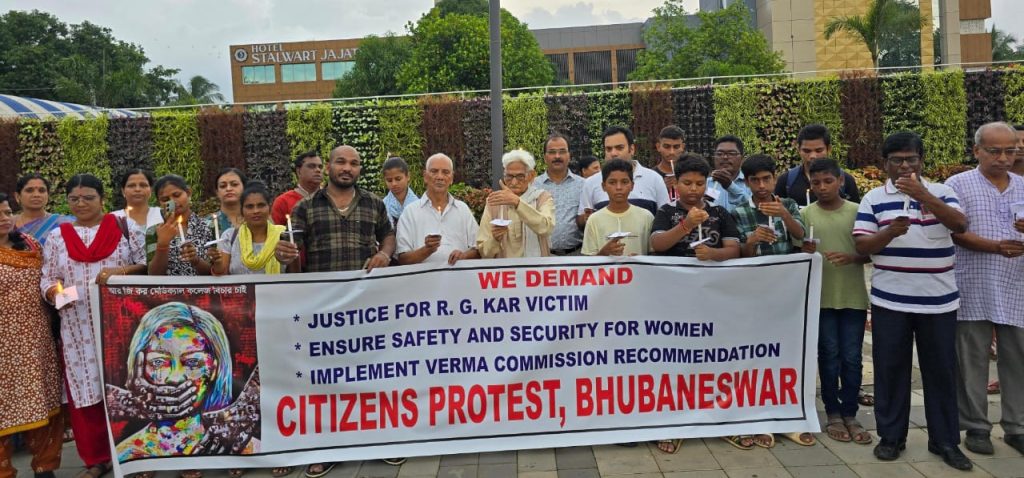 Members of Citizen Forum protest at Master Canteen Square in Bhubaneswar demanding justice for RG Kar victim