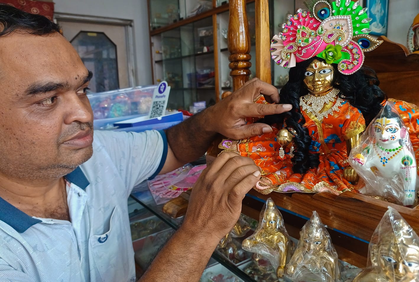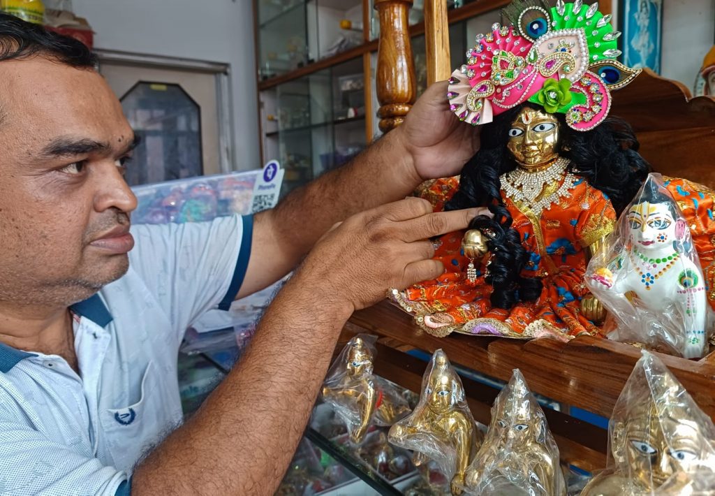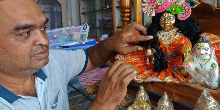 A trader displays idols of Lord Krishna for sale in his shop on Bajrakabati Canal Road in Cuttack, ahead of Janmashtami celebrations