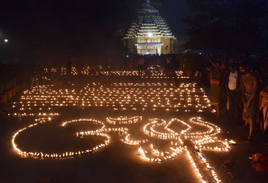 Devotees light candles to mark the passage of the Special Lingaraj Temple Act in the Odisha Assembly
