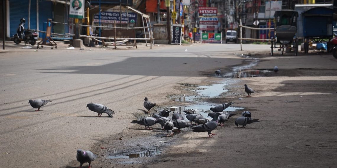 Pigeons search for food on Buxibazaar main road in Cuttack amid lockdown