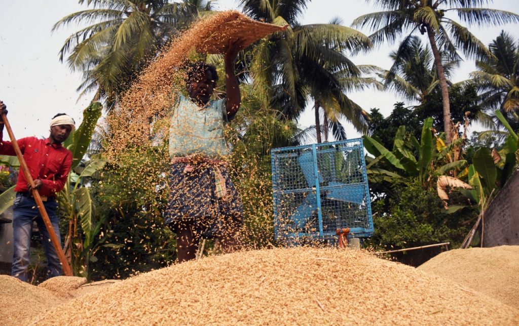 Farmers separating chaff from paddy by blowing air through it at Balianta