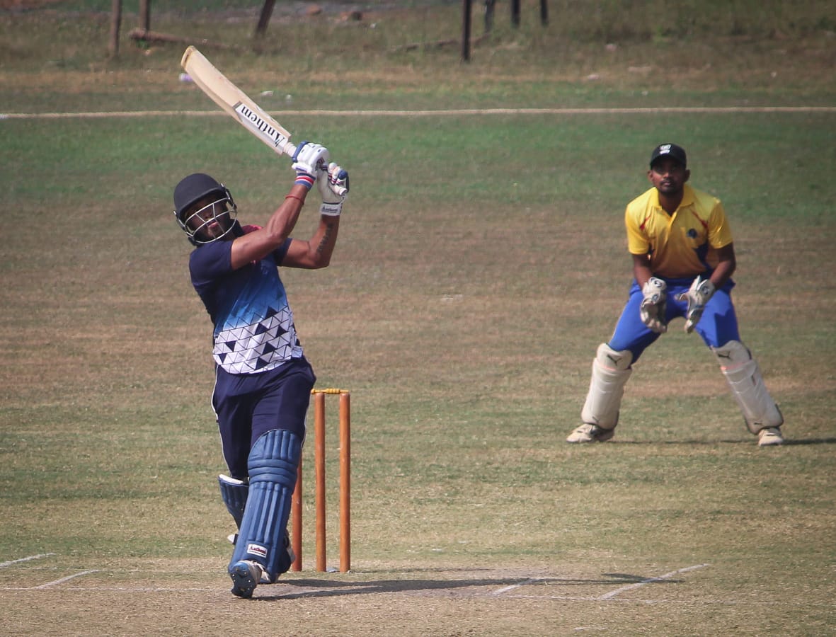 A batsman plays a fluent stroke in the ongoing Inter Dist. Senior Men T-20 Super League match between Balasore and Cuttack held at the Ravenshaw University ground