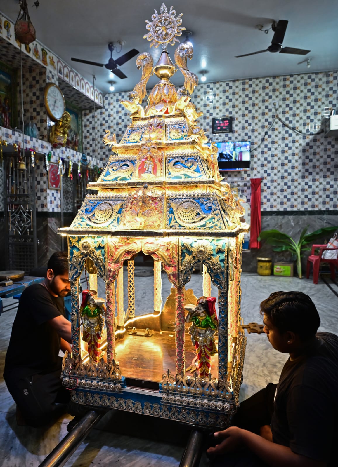 Silver ornaments being engraved on ‘Dola Vimana’ at Choudhury Bazar Puja Mandap in Cuttack