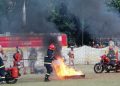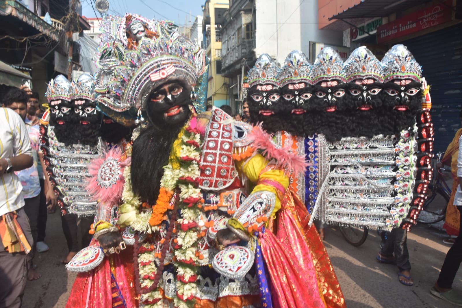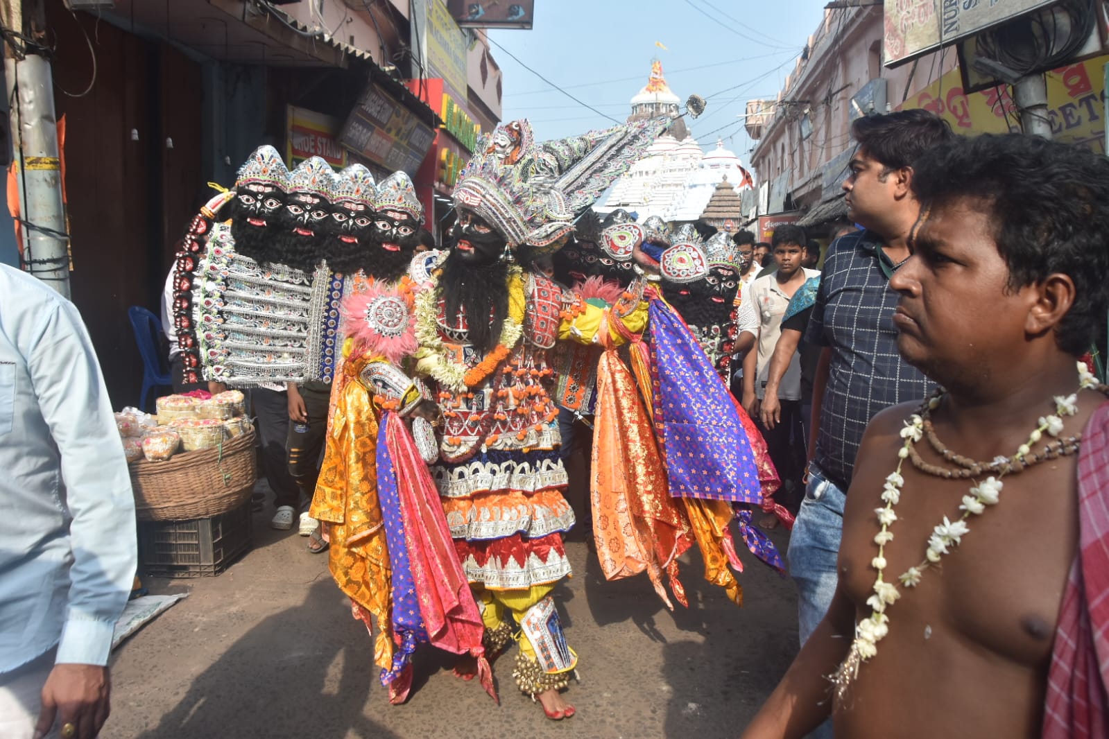 Artist portraying ‘Ravana’ performs in front of Lion Gate of Jagannath Temple on sixth day of Sahi Jata street theatre festival in Puri