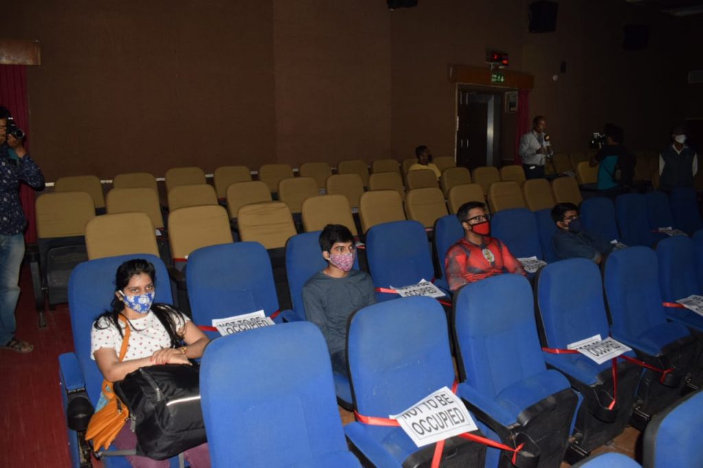 A man screens temperature of a movie-goer at Keshari Talkies in Bhubaneswar as theatres reopened