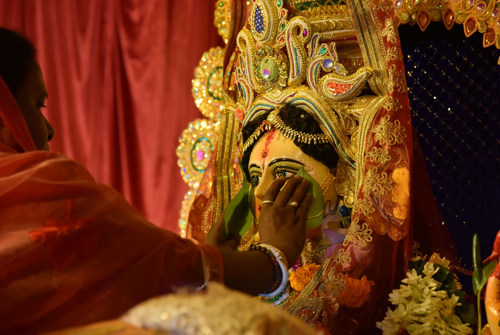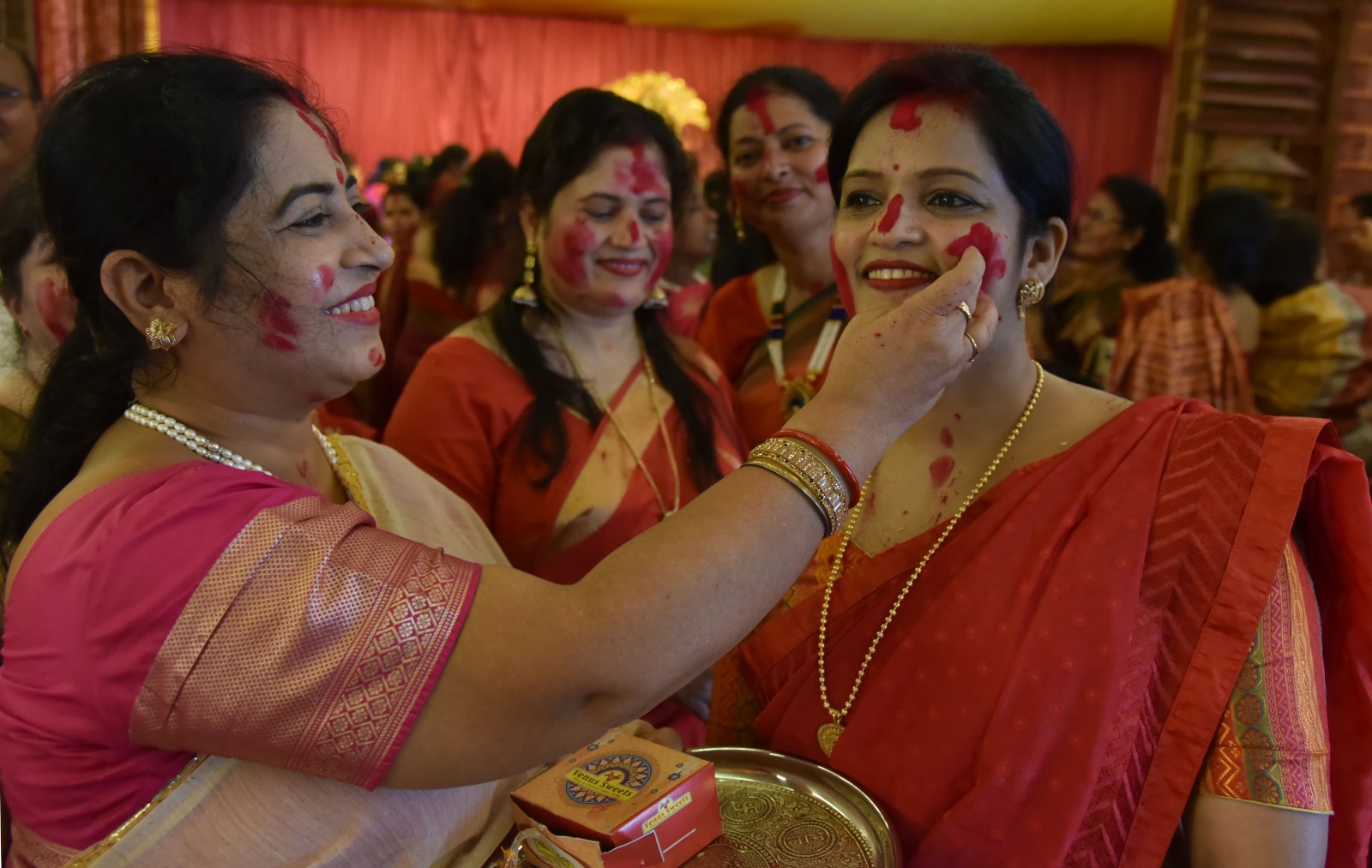 Women celebrate Sindoor Khela at Bapuji Nagar Gajalaxmi Puja Mandap in Bhubaneswar Wednesday.