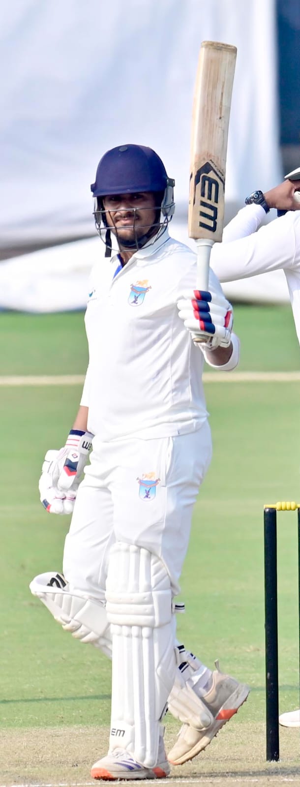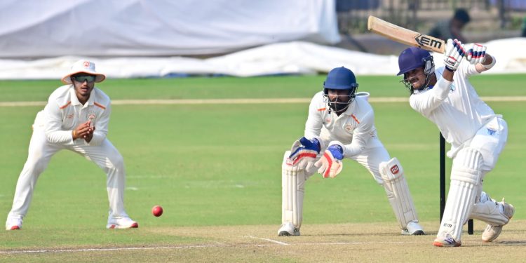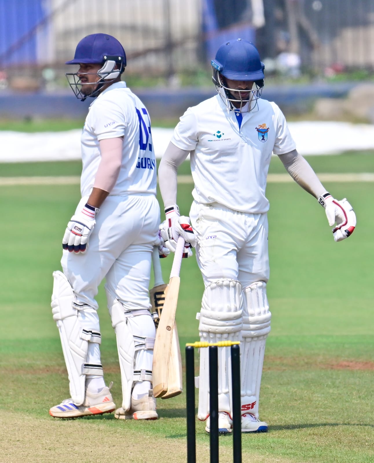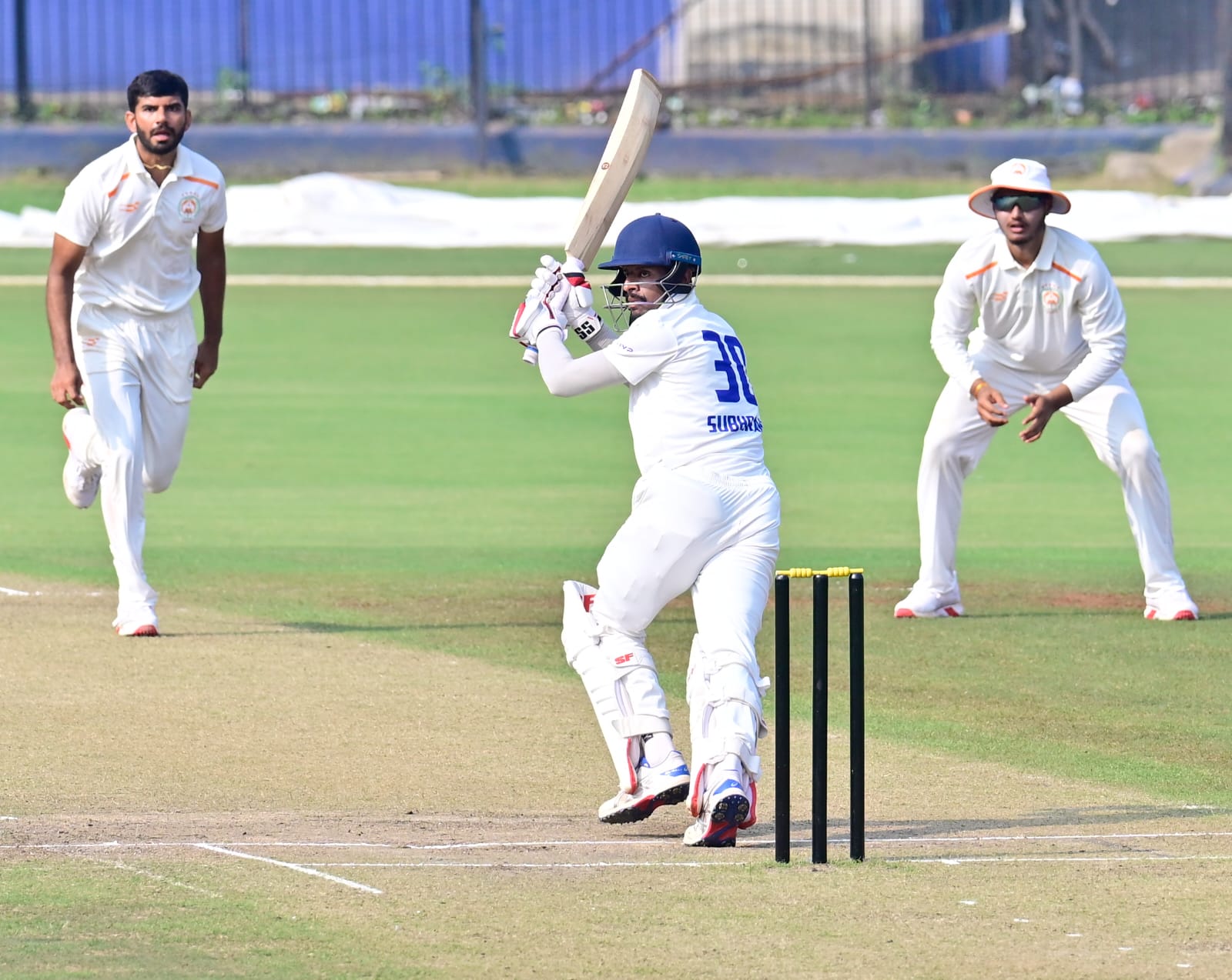 Odisha batsmen Rajesh Dhuper, Subhransu Senapati in action Day 1 of the Ranji Trophy match against Baroda at Barabati Stadium