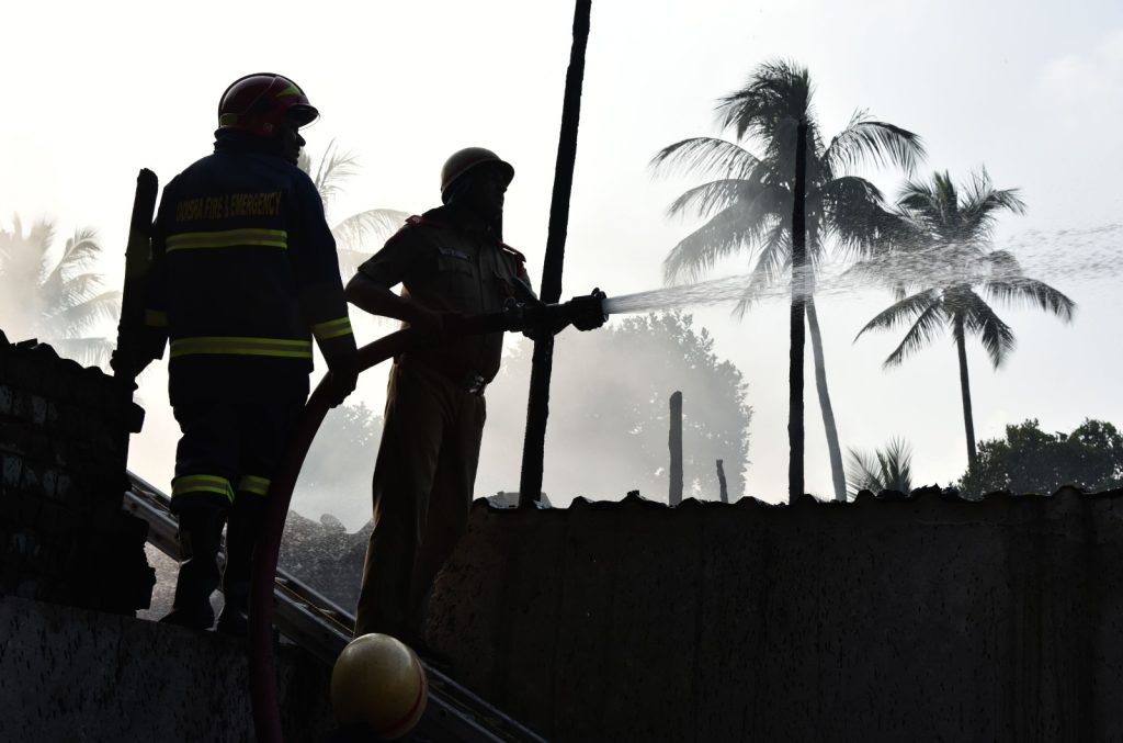 Firefighters douse flames after a major blaze gutted 15–20 shops at Unit-1 vegetable market in Bhubaneswar, Wednesday