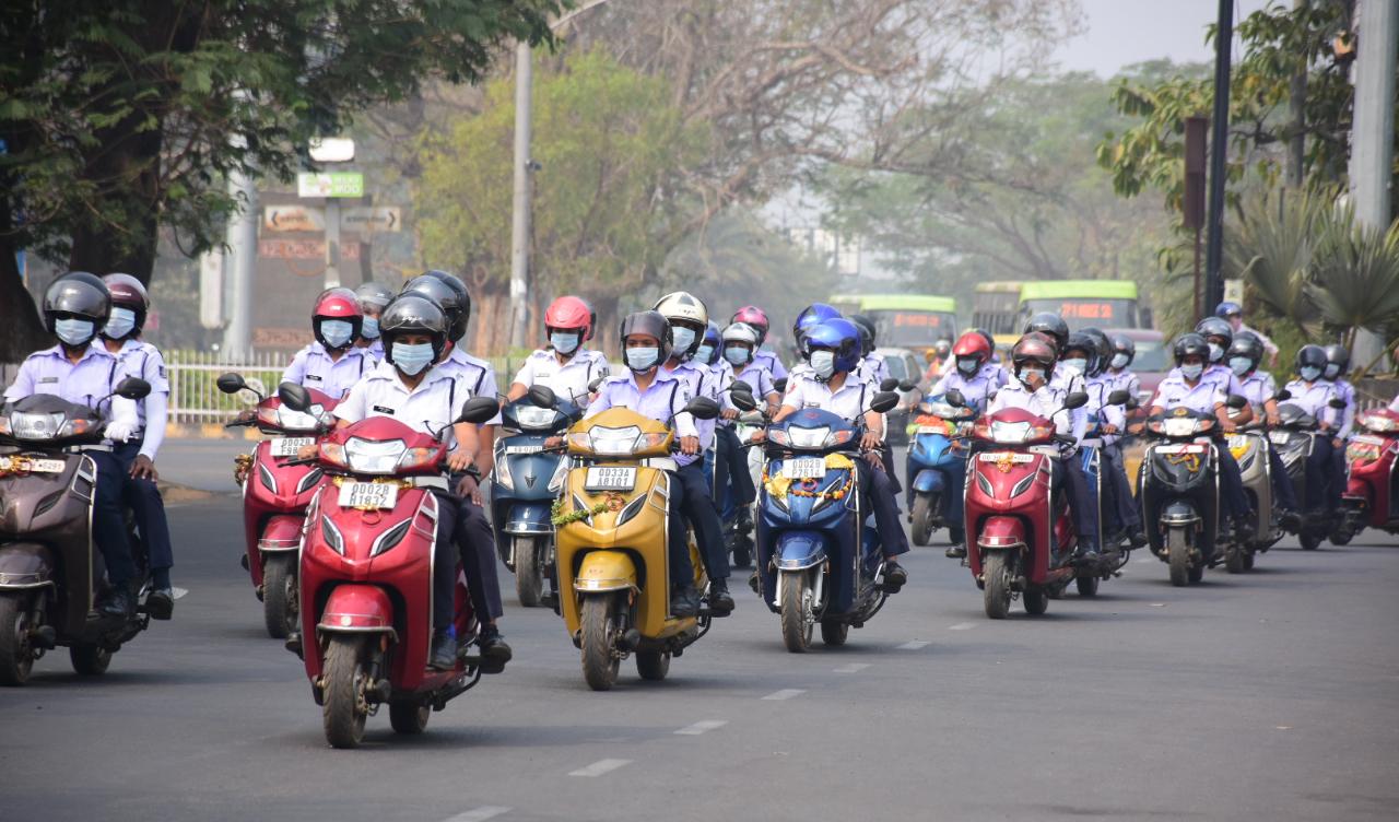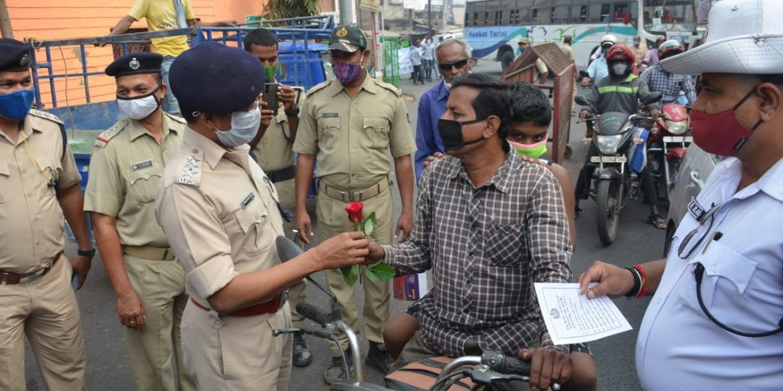 Traffic violators being sensitised on helmet-wearing with a present of rose and a pen during the 32nd Road Safety Week at Tata Benz squareSecurity personnel carry out inspection at Gandhi Marg(PMG) in Bhubaneswar, Monday, ahead of the Republic Day celebrations