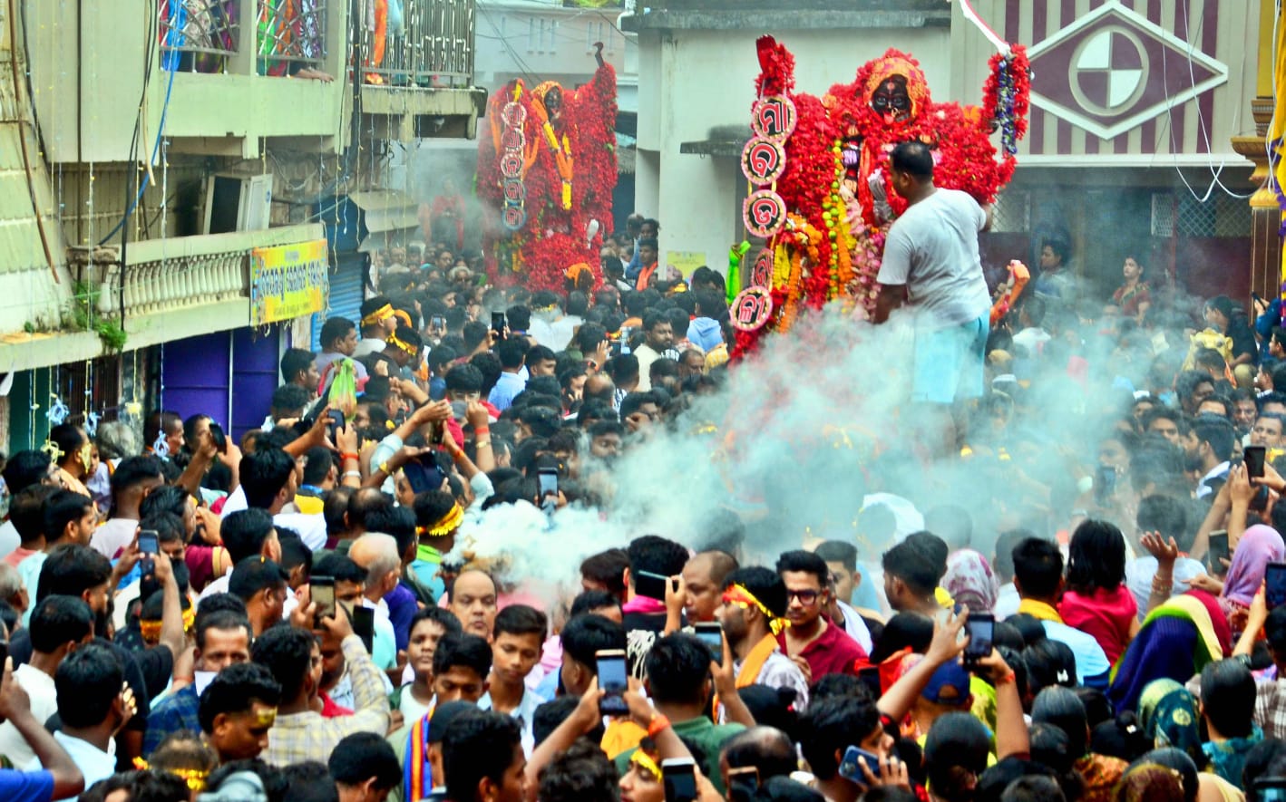 Idols of Goddess Kali being carried in processions for immersion in Cuttack’s Bidyadharpur area