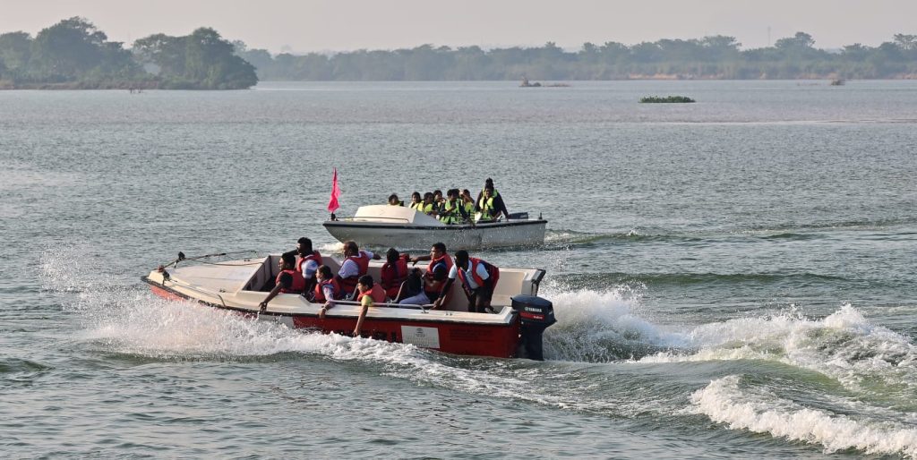Visitors enjoy boating on Mahanadi river near Gadagadia Ghat during Bali Jatra in Cuttack